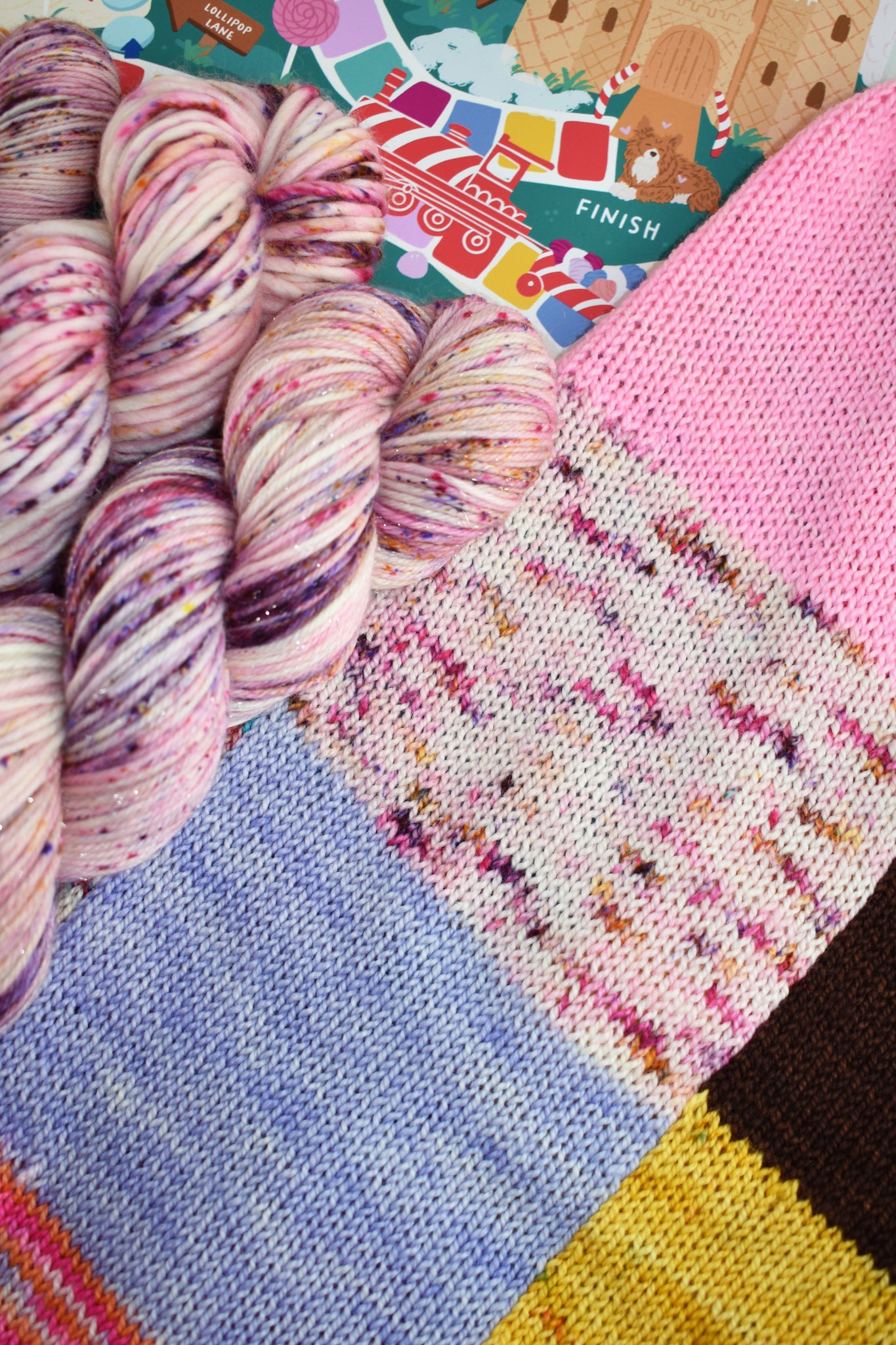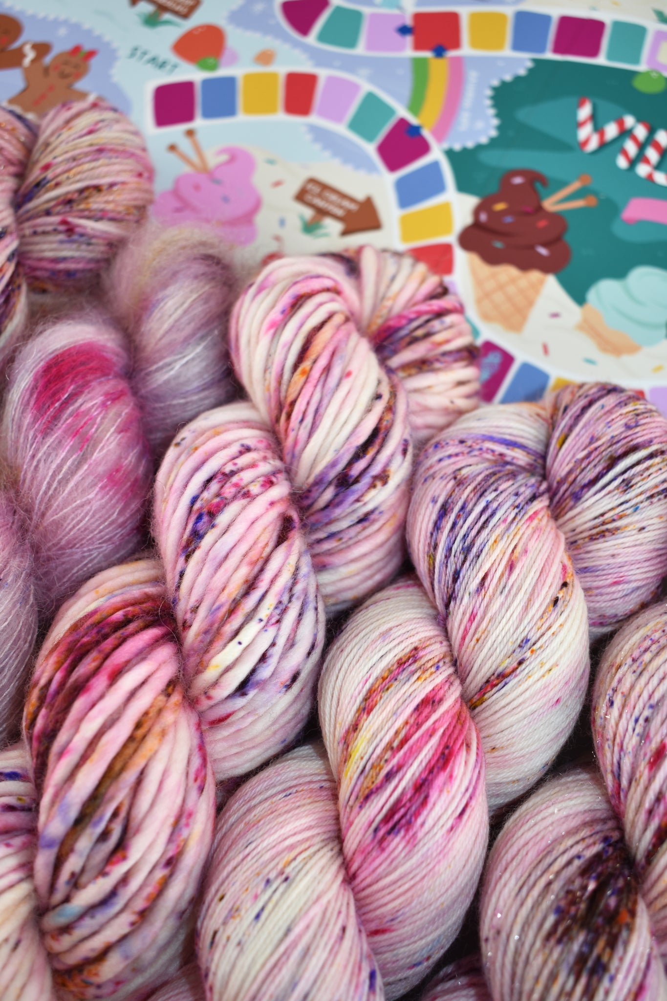 A whimsical lane dusted in pink sugar, twinkling lights, and a sweet sparkle. This colorway blends soft ballerina pink with purple plum whispers, golden brown cookie crumbs, and playful pink speckles, like sugar plums dancing in your head.pastel shawl, Lavender Taffy brings that nostalgic sweetness to every stitch. 🧶💭